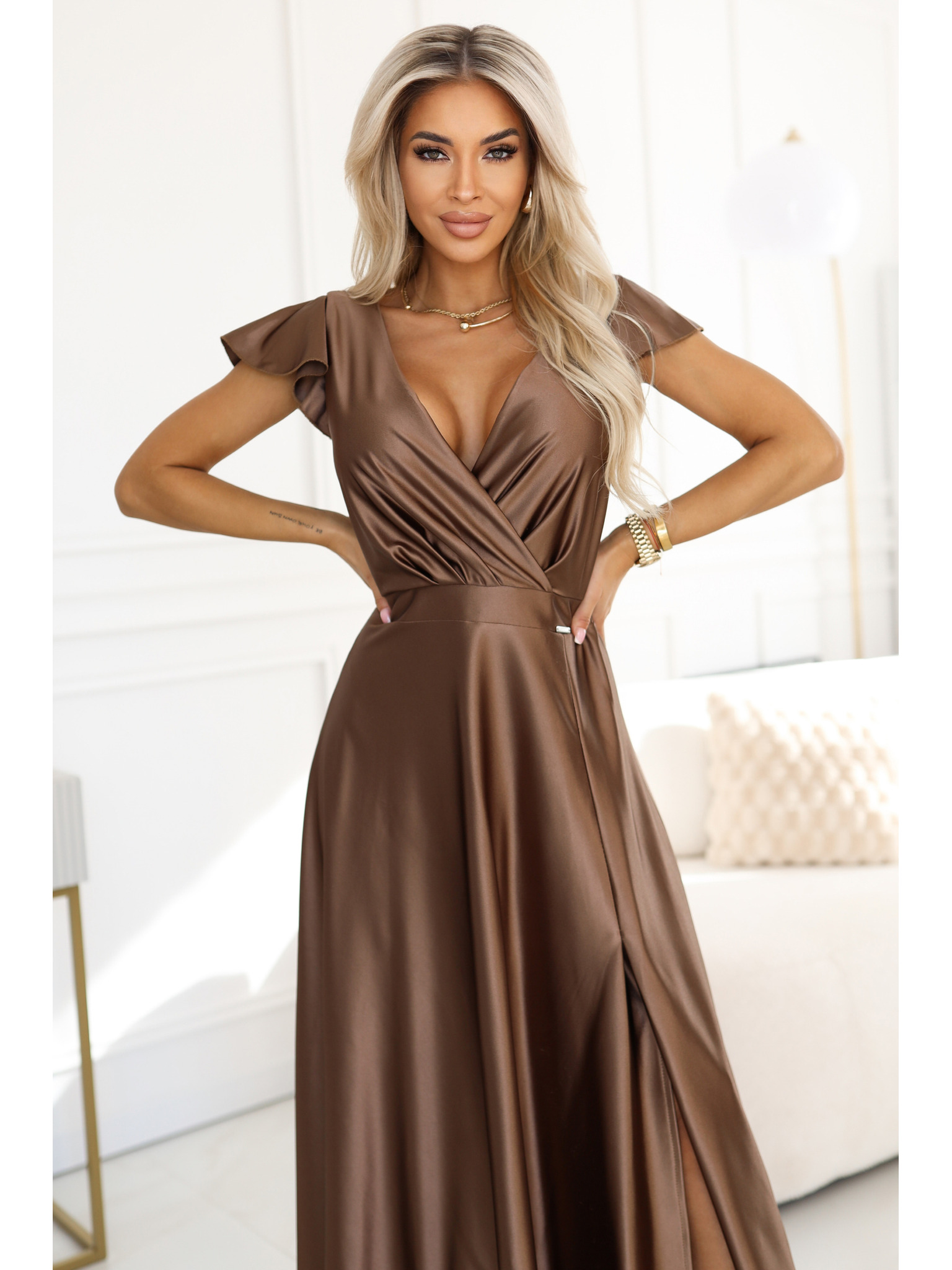 CRYSTAL Seiden-Maxikleid mit Ausschnitt - Mocha Mousse
