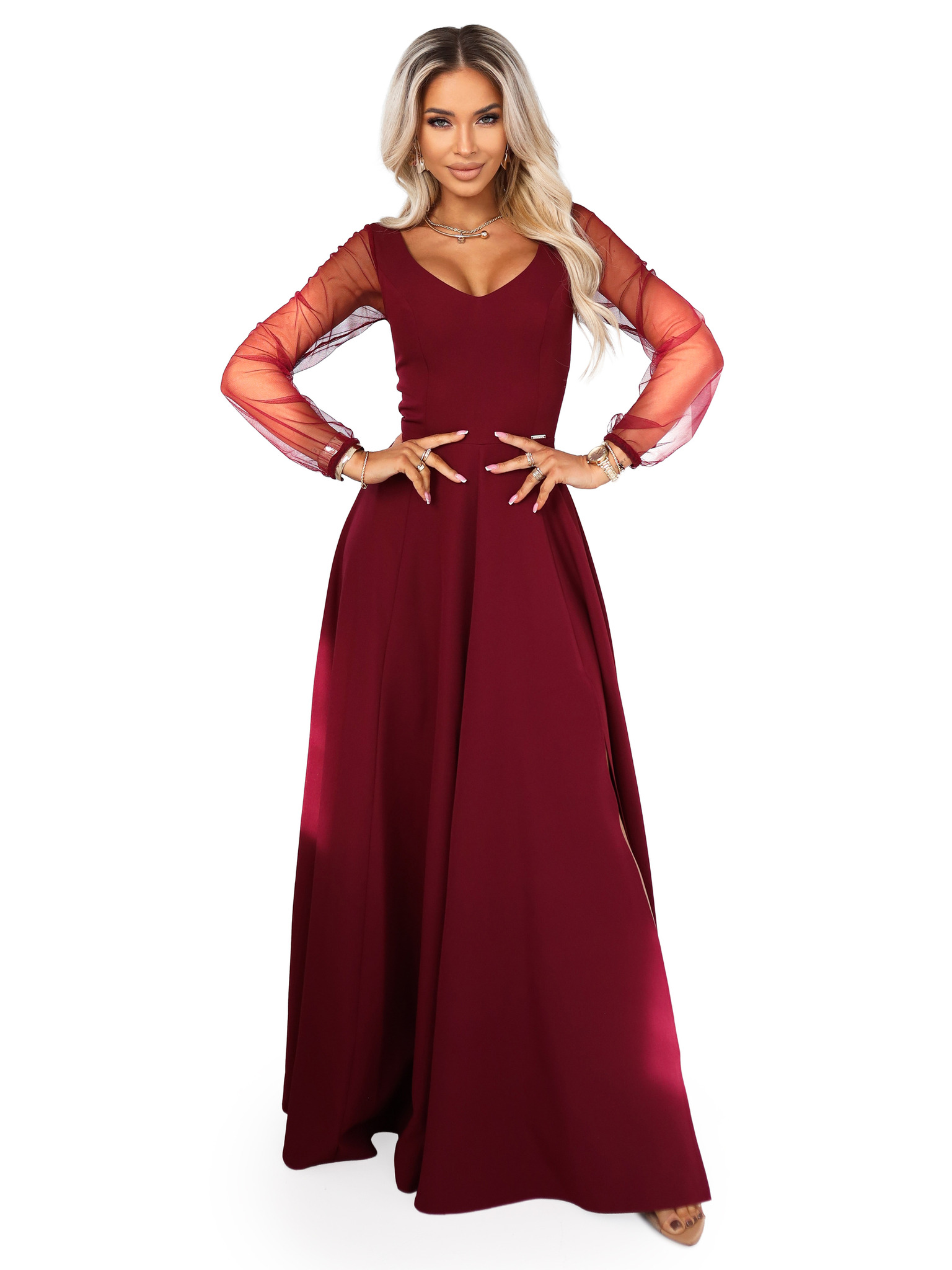 JENNIFER Langes Kleid mit Beinschlitz, Ärmeln und Ausschnitt - weinrot