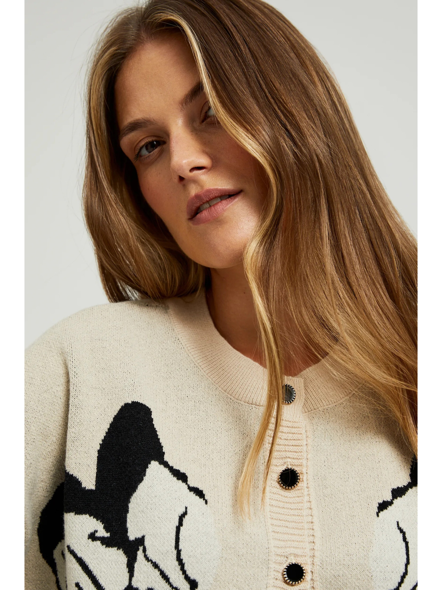 Beige Strickjacke mit langen Ärmeln und Tiermuster von Moodo